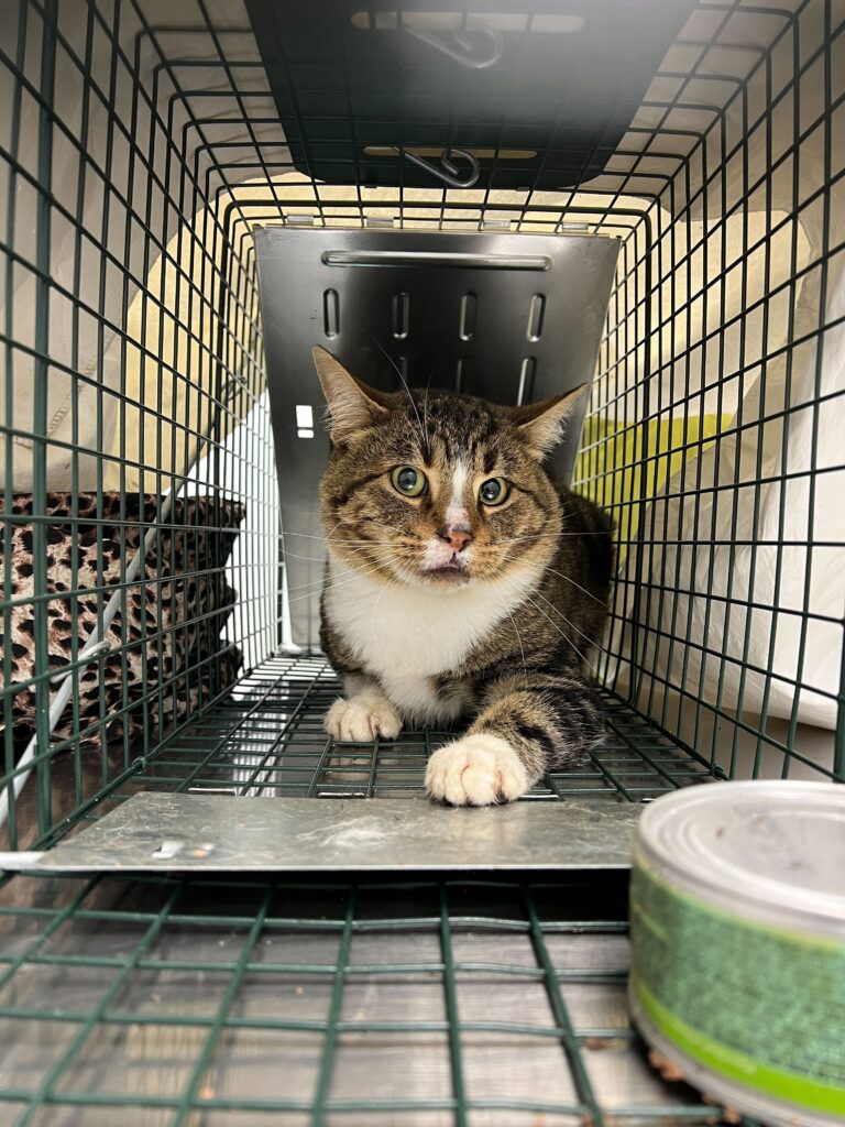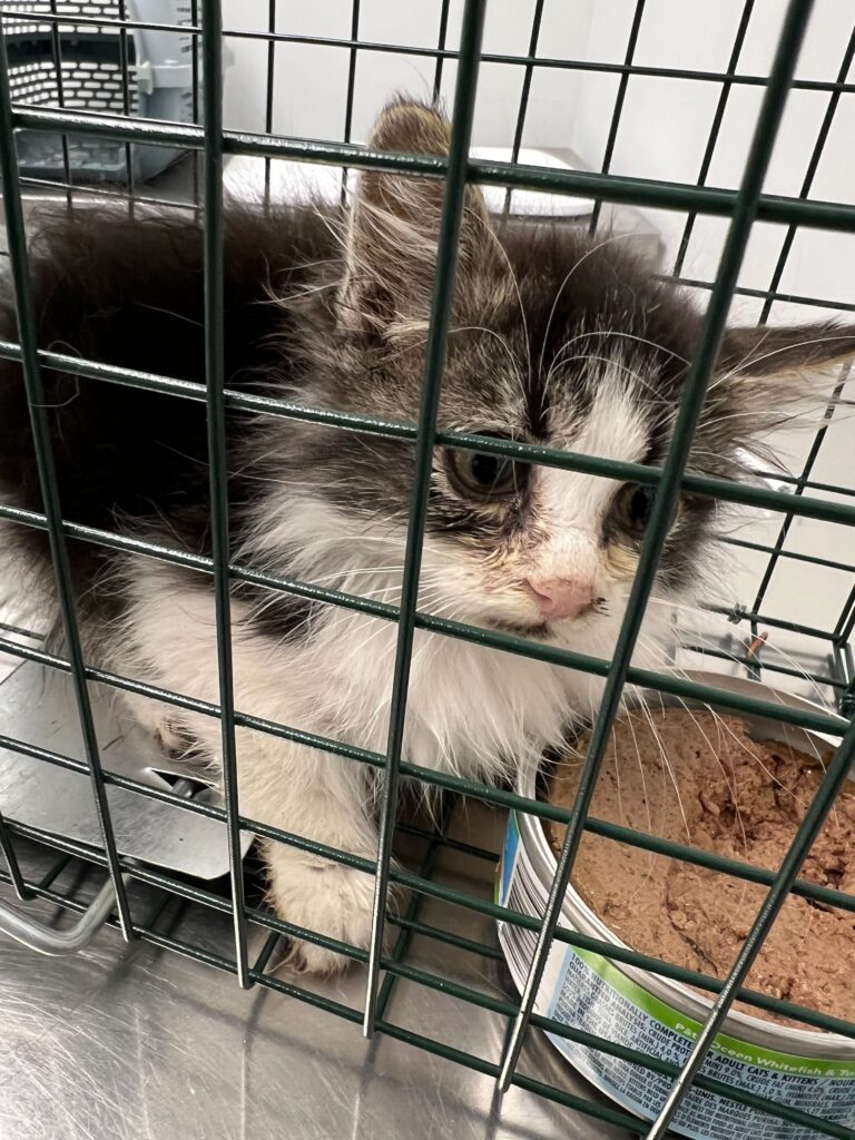 A kitten we recently pulled from a TNR site in the trap still before being reuinited with his brother.